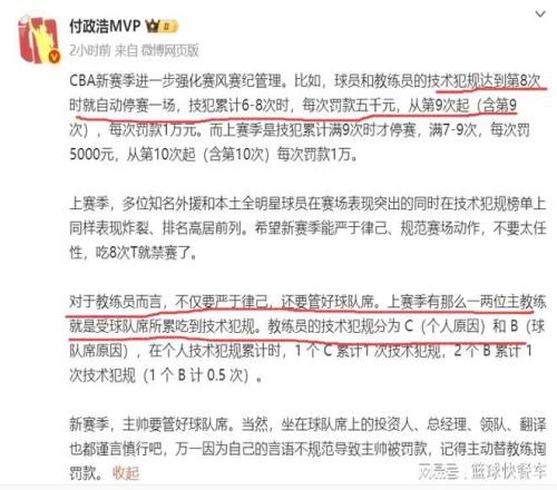 相比于上赛季,新赛季在针对球员和教练员技术犯规一事上,篮协还是抓得非常严厉的。上赛季,CBA球员和教练员要累计达到7次以上,才会被罚款,技术犯规达到10次以上,才会被重罚。而且,在禁赛方面,上赛季要达到9次以上,才会被禁赛。很显然,篮协和CBA的做法已经非常明显了,他们不希望新赛季会再次出现像上赛季那样的情况,球员和教练员都必须恪守新规。