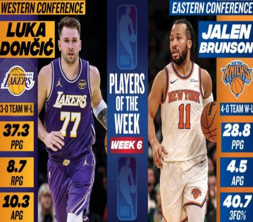NBA官方公布了第6周的东西部周最佳球员,东部由尼克斯后卫布伦森当选,西部由湖人后卫东契奇当选。布伦森上周场均贡献28.8分+4.5助攻,带领尼克斯取得4胜0负的战绩。据统计,这是布伦森生涯第8次当选周最佳球员。东契奇上周场均爆砍37.3分+8.7篮板+10.3助攻,带领湖人取得3胜0负的战绩。据统计,这是东契奇生涯第15次获此殊荣。值得一提的是,贝恩、布朗、希罗、杰伦约翰逊、西亚卡姆、埃迪、华子、亚历山大、穆雷和里夫斯等球星获得了周最佳提名。