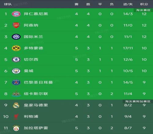 北京时间11月26日,欧冠第5轮率先结束了9场比赛,最新积分榜如下!