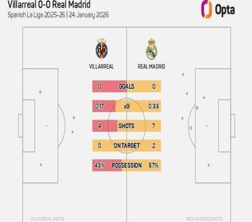 西甲第21轮,皇家马德里客场对阵比利亚雷亚尔,上半场战罢,比分为0-0,据统计,皇马是2026年五大联赛唯一上半场还没...